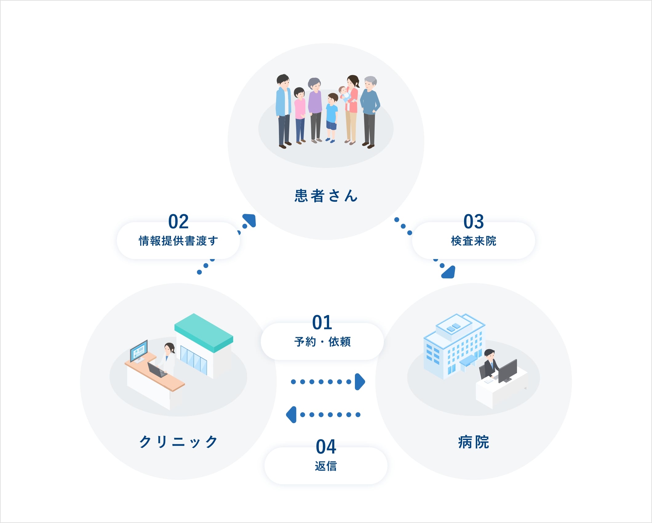 地域医療連携室は、患者さんが住み慣れた地域で安心して医療を受けられるよう、地域の「かかりつけ医」の先生方と病院をつなぐ窓口です。主な役割は、以下の通りです。
